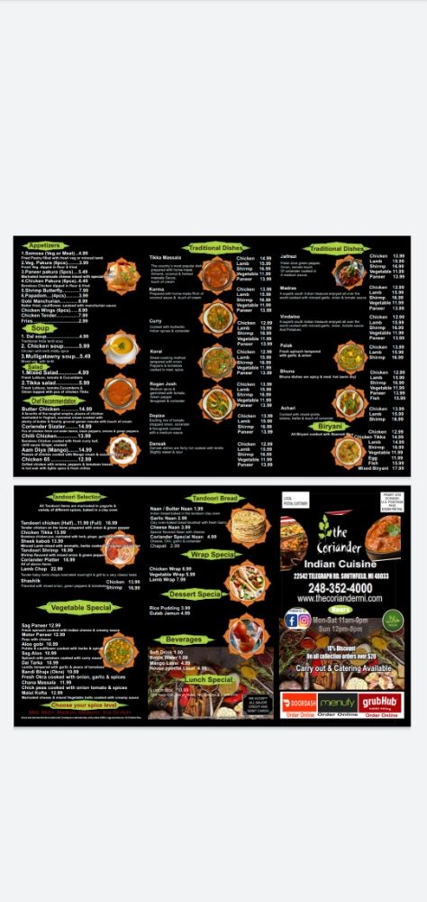 Welcome to The Coriander Indian Cuisine, a hidden gem located in Southfield, MI, offering a delightful array of Halal Indian dishes. The menu caters to various palates, with ample vegetarian options and renowned favorites such as butter chicken, goat korai, and flavorful biriyanis. Each dish bursts with authentic spices and is made with love, ensuring every bite takes you on a culinary journey.